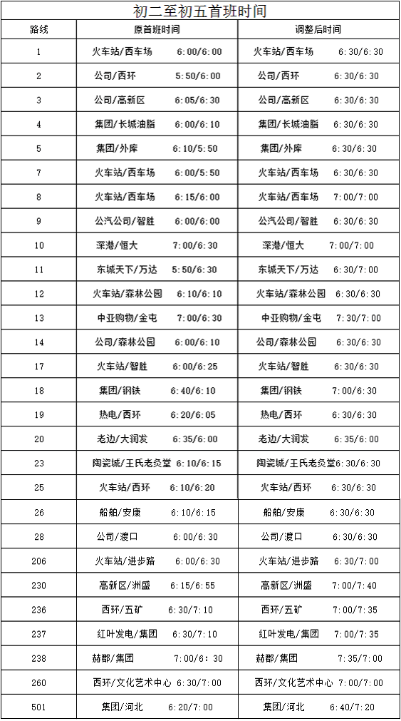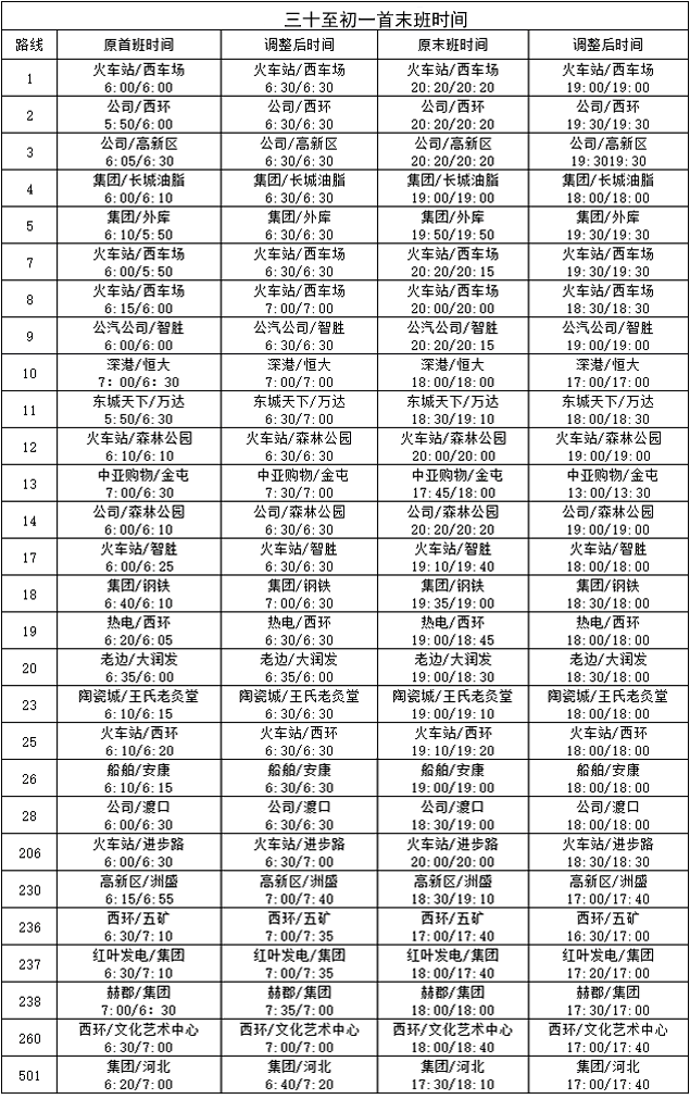 1月27日—30日(三十至初三)首班車6:00(火車站)調(diào)整為6:30,其余班次不變。